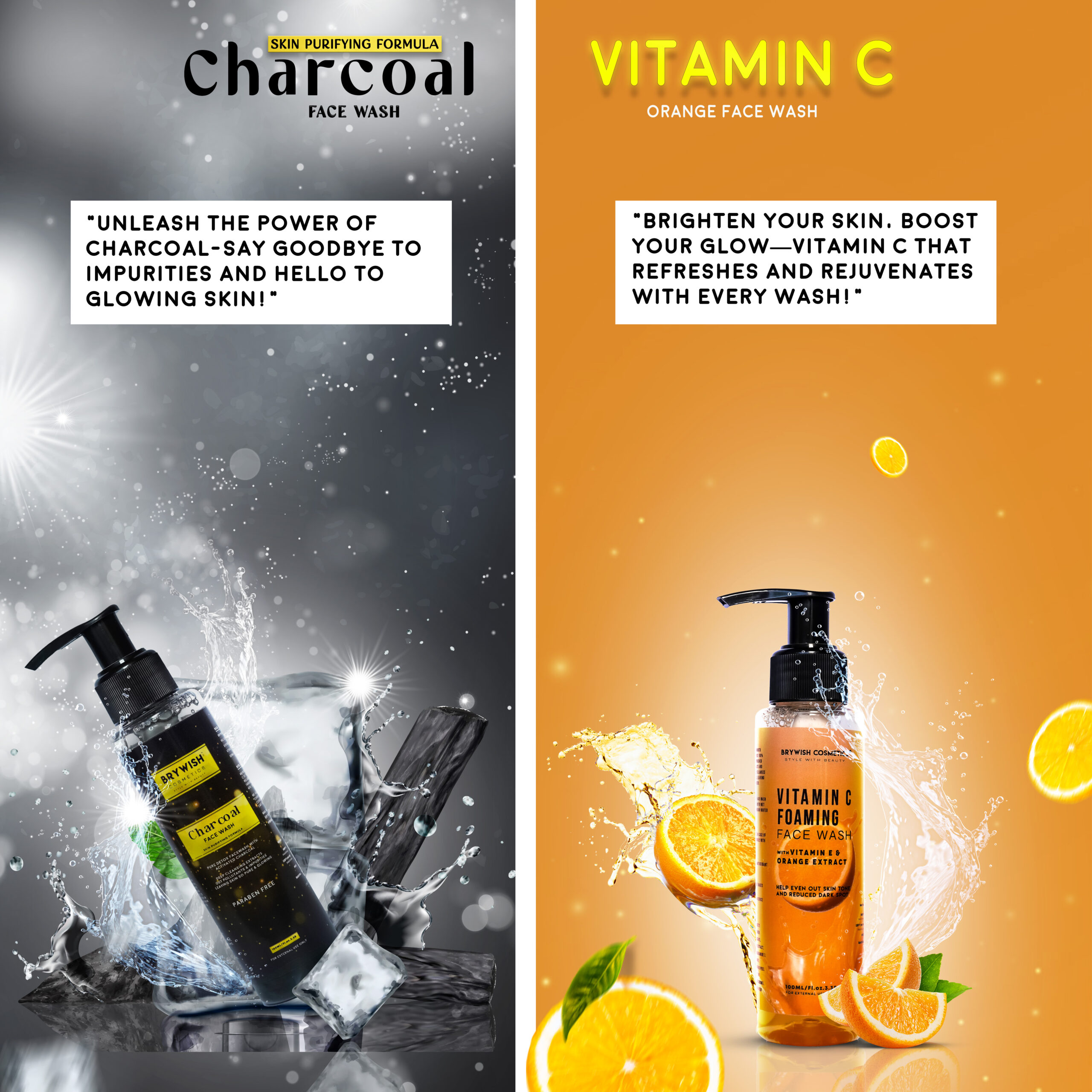 Vitamin C face wash in morning for all day bright and fresh skin and Charcoal face wash at night to remove all day dirt and pollutants out of skin.